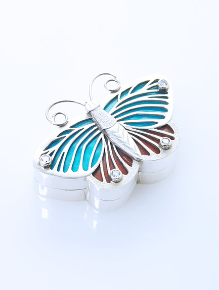 My work can depict the narrative, humour, also a sense of fun, or be more abstract. Each piece is handcrafted with great attention to detail sometimes incorporating precious, semi-precious stones or enamelling.